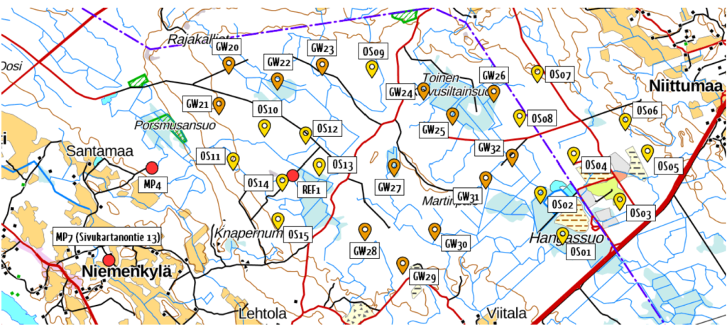 Kuvassa mittauspisteiden (punaisella) ja turbiinien (Suomen Hyötytuuli Oy:n turbiinit keltaisella ja Gigawatti Oy:n oranssilla) sijainnit.